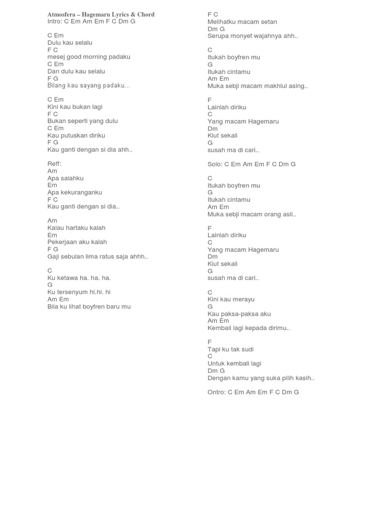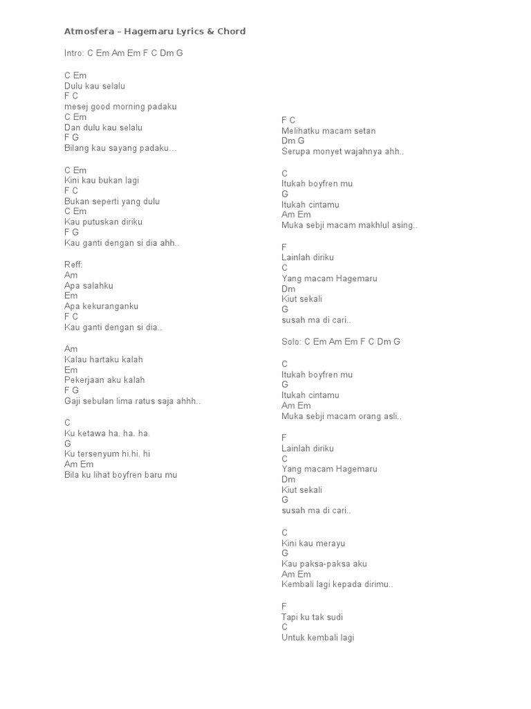 . Semoga anda semua terhibur. Kunci Gitar dan Lirik Lagu Atmosfera - Hagemaru bisa menjadi referensi saat kamu bermain gitar. Hagemaru Dulu kau selalu Mesej good morning padaku Dan dulu kau selalu Bilang kau sayang pada ku Kini kau bukan lagi.